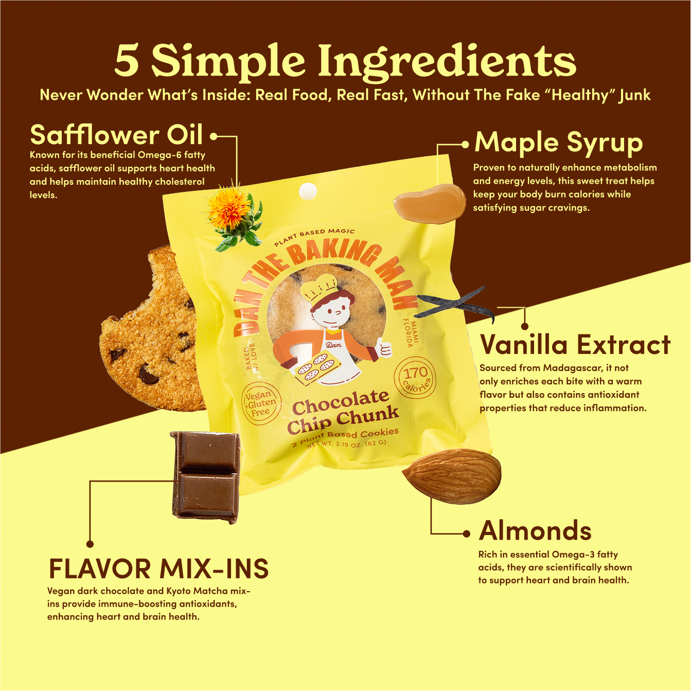 Almond flour, safflower oil, maple syrup, vanilla, and your favorite mix-ins. That’s it.